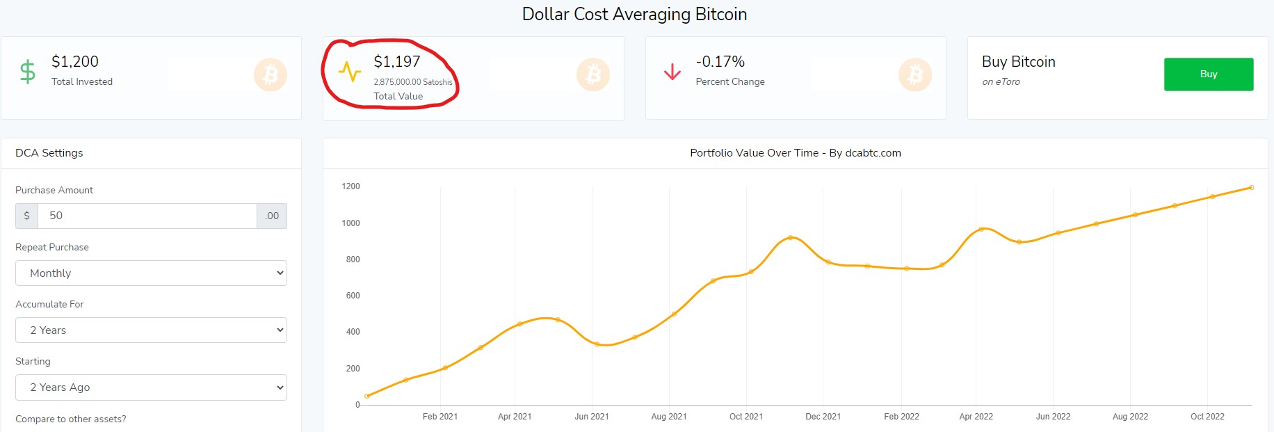 Even simulating $50 dollars in Bitcoin sales per month over the last 2 years where price has been in steady decline, interestingly does not produce significant losses as can been seen in the Dollar Cost Averaging (DCA) chart below. Remember, the opposite scenario is also possible where the Bitcoin price recovers and goes on towards new highs magnifying gains. Reality may sit somewhere in between.